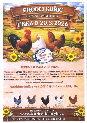 Prodej kuřic se koná 20. března 2026 v Miřkově od 9:50. Klatovské Rybářství a.s. nabízí kuřice ve stáří 15 týdnů za cenu 280 Kč. Na výběr máte z plemen Dominant Modrý, Kropenatý, Sussex a červený. Časy prodeje jsou orientační podle aktuální dopravní situace.