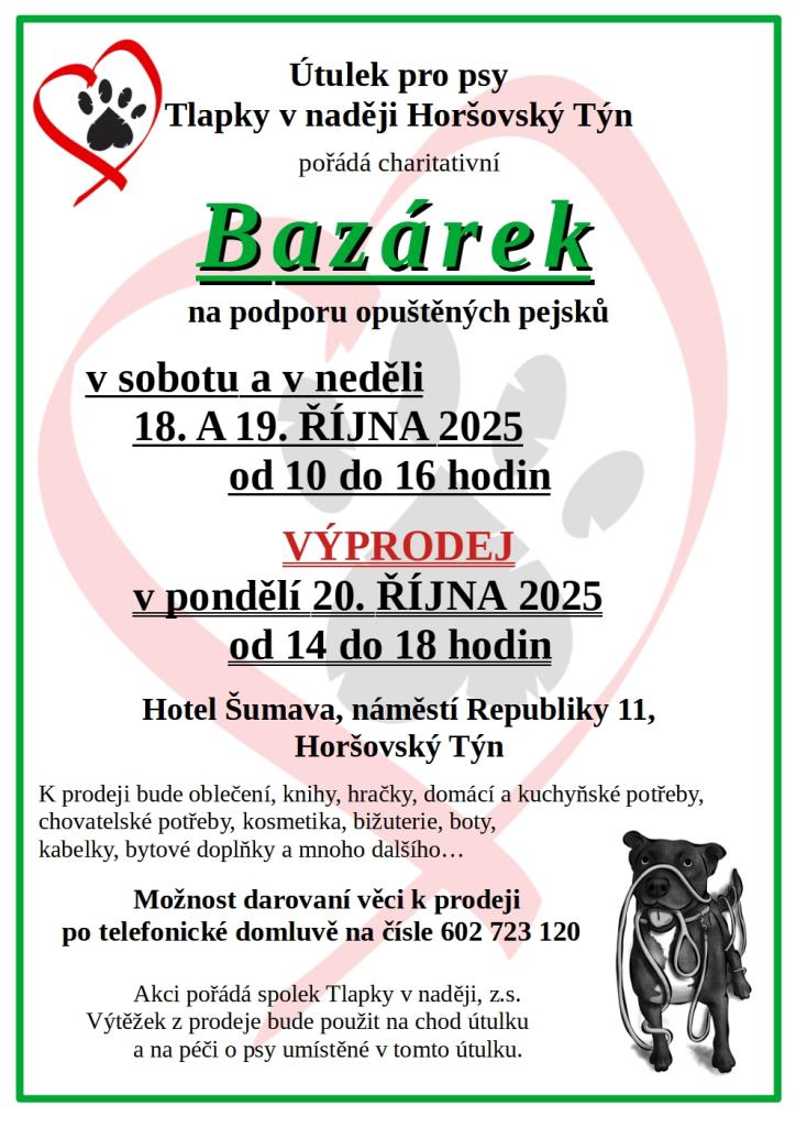 Útulek pro psy Tlapky v naději Horšovský Týn pořádá charitativní Bazárek
