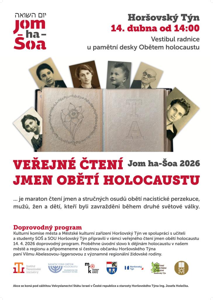 na programu: veřejné čtení jmen obětí holocaustu, dějiny holocaustu v našem městě a regionu, připomeneme si čestnou občanku Horšovského Týna paní Vilmu Abelesovou – Iggersovou z významné regionální židovské rodiny
