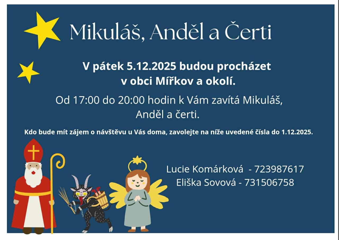V pátek 5. prosince 2025 se v obci Mířkov a jejím okolí uskuteční tradiční akce s Mikulášem, Andělem a čerty. Od 17:00 do 20:00 hodin budou navštěvovat domácnosti, které si objednají jejich příchod. Pokud máte zájem o jejich návštěvu, neváhejte se ozvat na uvedené kontakty do 1. prosince 2025.
